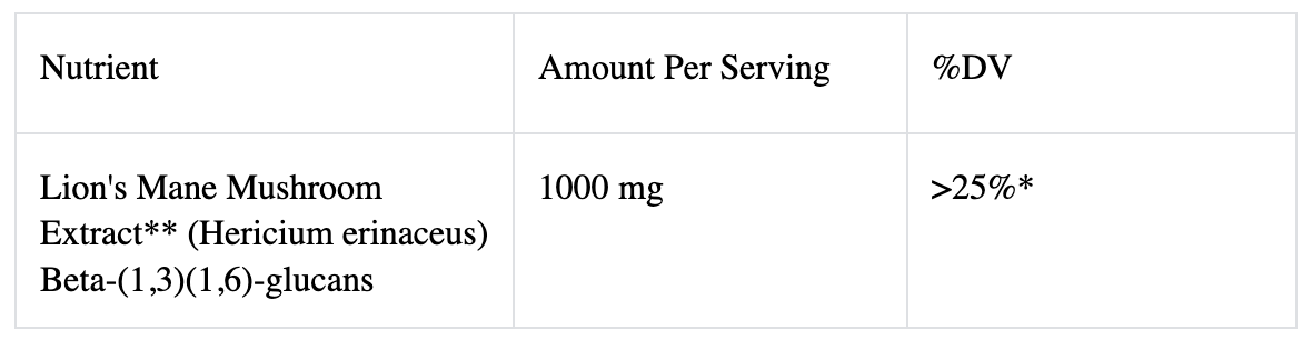 Supplement Facts: Serving Size: 2 Capsules Servings Per Container: 30. Warning: If you are pregnant, nursing, taking any medications or have any medical condition, consult your doctor before use. Discontinue use and consult your doctor if any adverse reactions occur. Keep out of reach of children. Do not use if seal under cap is broken or missing. Guaranteed quality through expiration when continuously stored in the original packaging as directed. Store in a cool, dry place away from direct sunlight. lions mane ingredients